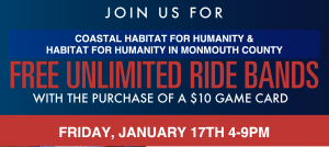 Join us at iPlay America in Freehold, NJ for Coastal Habitat for Humanity and Habitat for Humanity in Monmouth County’s FREE ride night on Friday, January 17, 2020 from 4-9 pm.