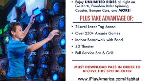Plus, if you eat at iPlay America’s in house restaurant Game Time Bar & Grill during the event 20% of your food bill will be donated to the cause. You must mention Habitat to your server during your visit.