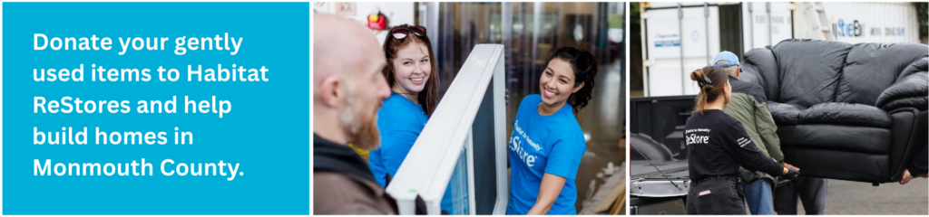 Habitat for Humanity ReStores are home improvement and resale stores that accept donations of new or gently used furniture, appliances, housewares, building materials, and more. The proceeds from these sales directly support Habitat’s mission to build homes and strengthen communities right here in Monmouth County.
